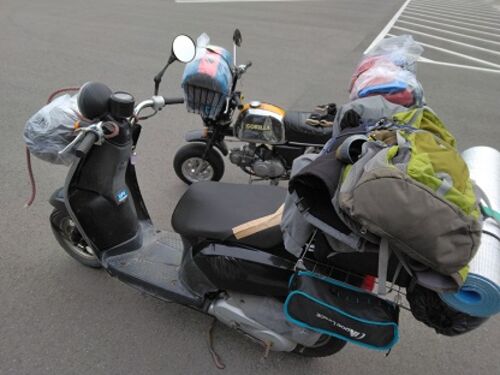 5月3日(土) 原付でキャンプに行く。 そんなあほな、と思うかもしれないが原付のひ弱な積載量でいかにしてテントやら寝袋やらを積んで走るか?というのが面白いのである。 メンバーは4人。 カブとモンキーとゴリラと僕のスクーター(後輩にもらった) 荷物を…